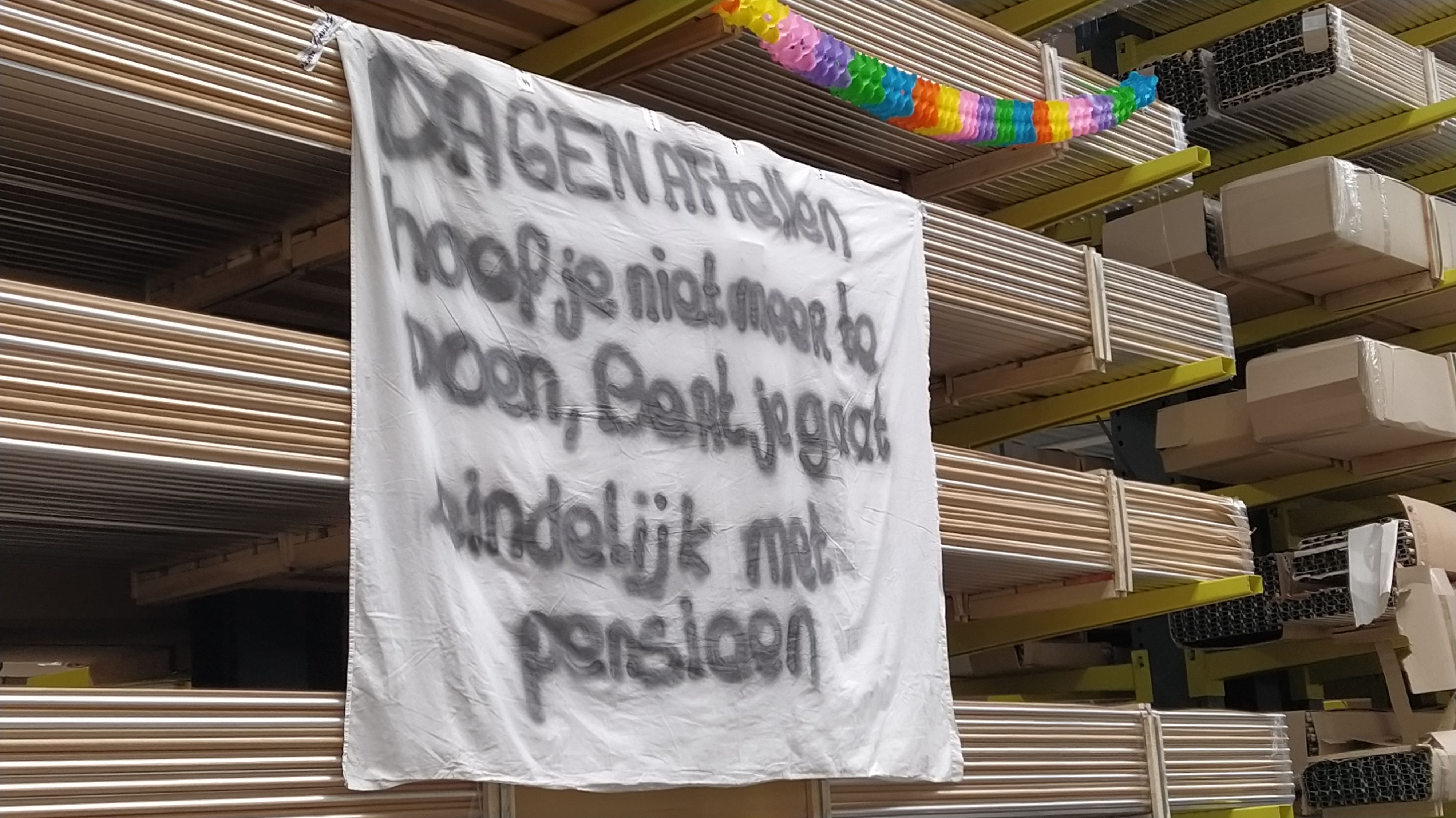 Deze morgen werd Bert bij binnenkomst, op zijn officieel laatste werkdag, verrast door zijn directe collega's met slingers en balonnen en een immens spandoek met de tekst: "DAGEN AFTELLEN HOEF JE NIET MEER TE DOEN, BERT. JE GAAT EINDELIJK MET PENSIOEN".